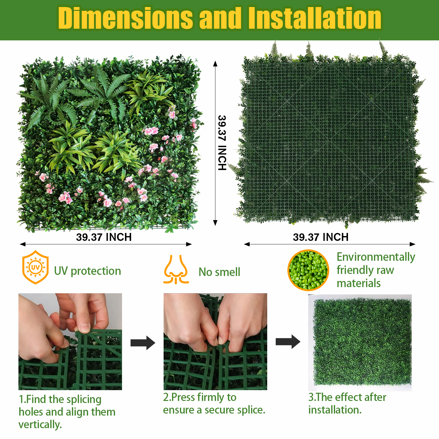 In public and temporary scenarios, the product's advantages are more prominent. In crowded areas such as campus activity areas, municipal square green corners and office building ecological terraces, it can maintain a green state for a long time without potential safety hazards; for temporary scenarios such as green exhibitions, parent-child carnivals and festival displays, its characteristics of quick splicing and reuse can efficiently create an eco-friendly and aesthetic green atmosphere, balancing practicality and social benefits, and becoming the preferred solution for public greening decoration.