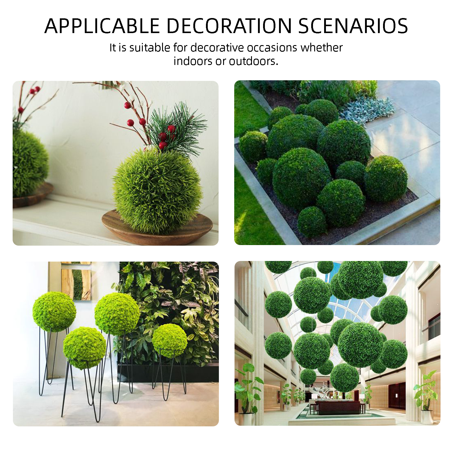 In public and temporary scenarios, the product's advantages are more prominent. In crowded areas such as park leisure areas and municipal square green belts, the use of this grass ball can maintain the greening state for a long time without special care; for temporary scenarios such as outdoor exhibitions, festival displays and brand pop-up stores, its characteristics of quick assembly and reuse can efficiently create a natural atmosphere while controlling costs, making it the preferred decoration for various scenarios.